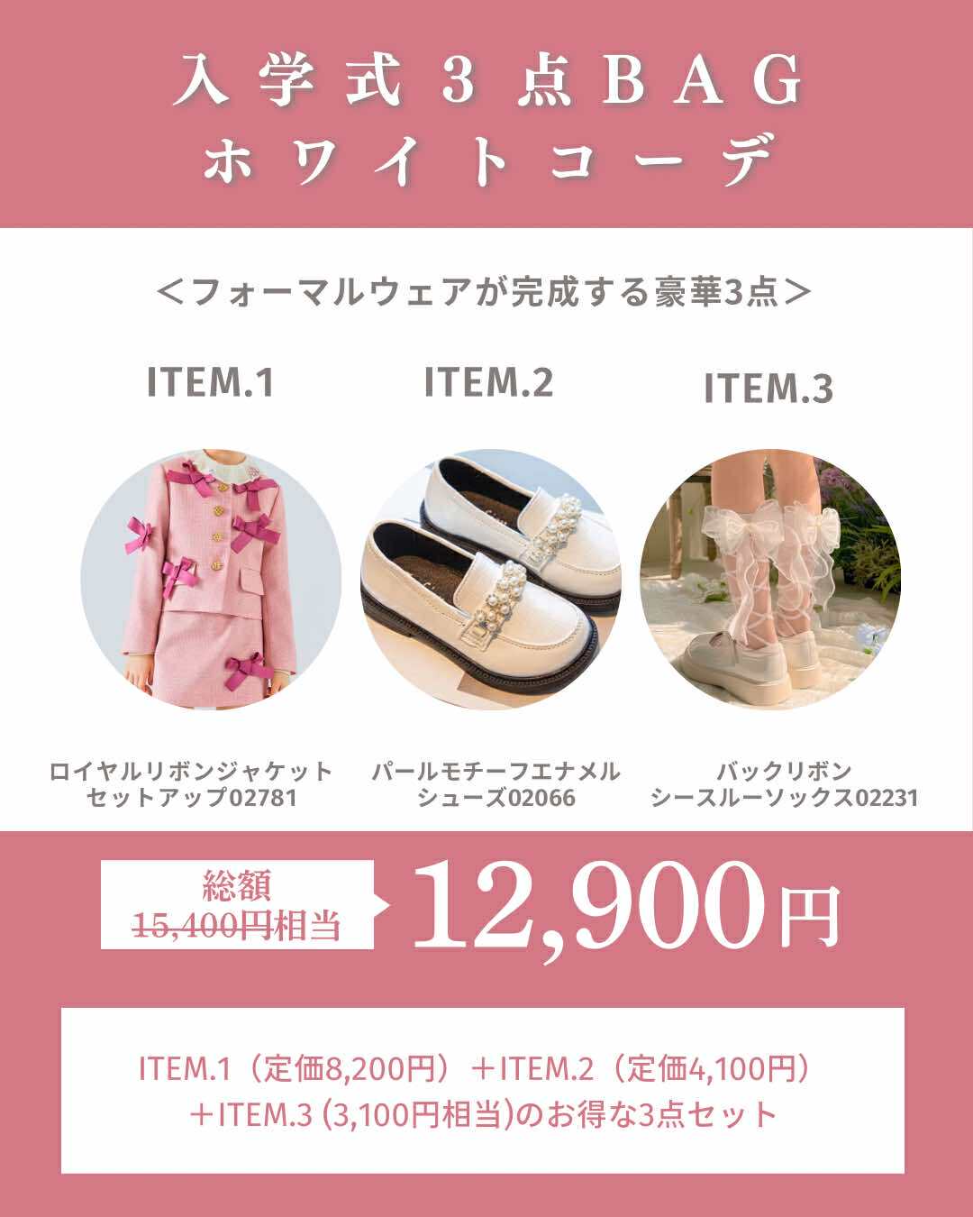 セットアップと靴と靴下の3点で、入学式の全身コーデが迷わず完了する、入学式3点BAGをご用意。