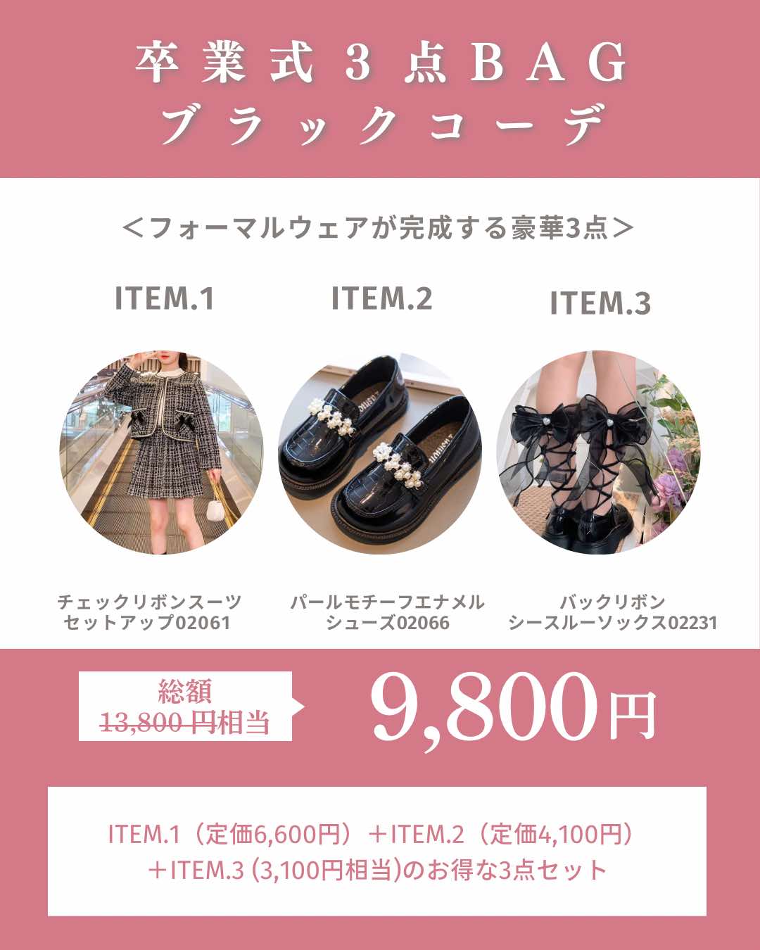セットアップと靴と靴下の3点で、卒業式の全身コーデが迷わず完了する、卒業式3点BAGをご用意。